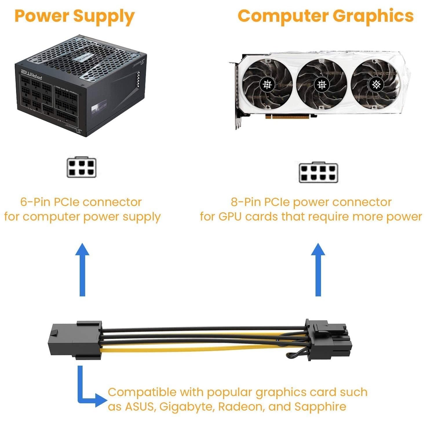 • Wide Compatibility :- This 6 pin to 8 pin extension cable compatible with graphics cards with 8 pin PCIe connectors from popular manufacturers such as ASUS, Gigabyte, Radeon, and Sapphire