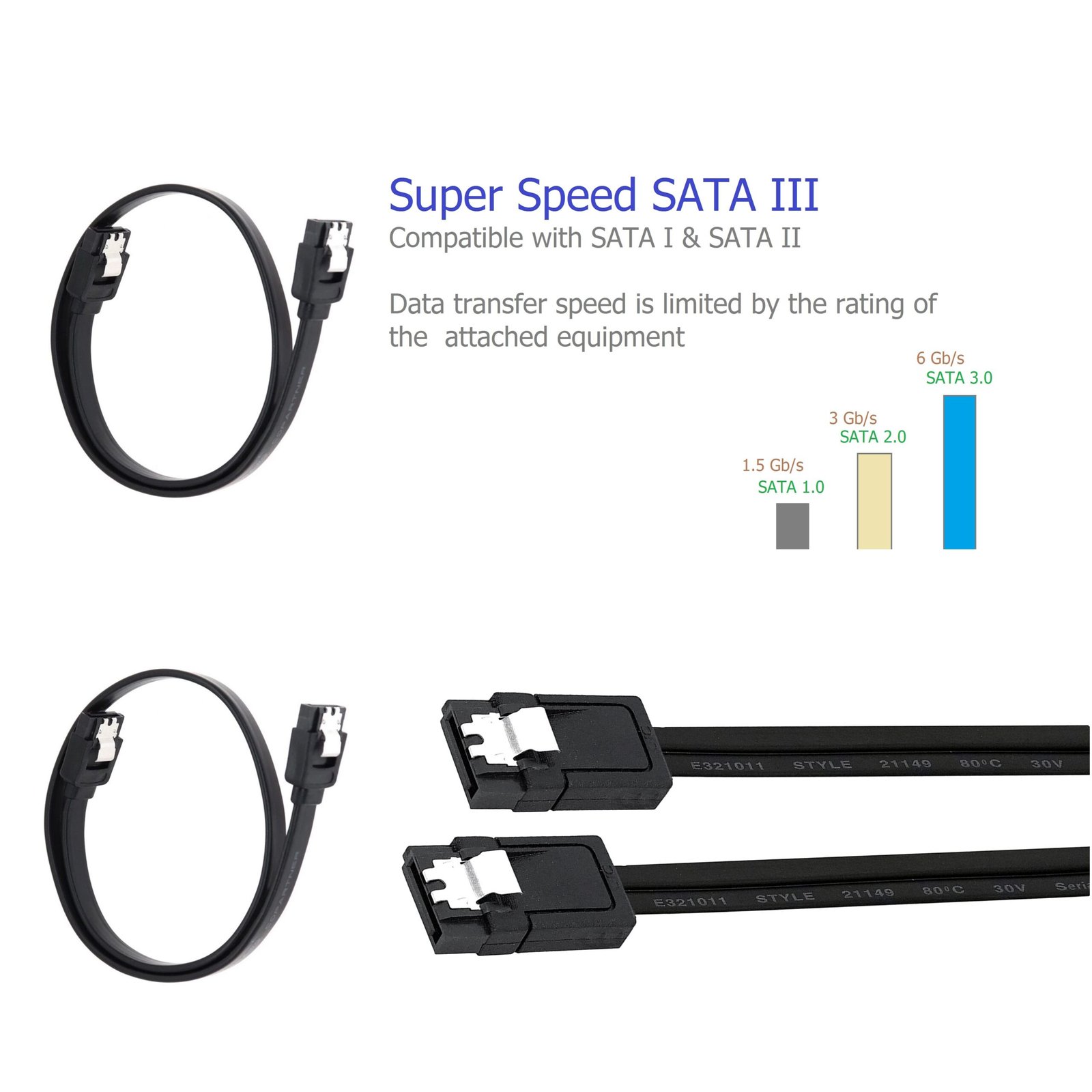 SATA revision 3.0 ( SATA III) provides up to 6 Gbps data throughput Secure Connection: Locking latch on each end of the cable to ensure secure connections for fast and reliable file transfer. Backwards compatible with SATA revision 1 and 2 ( SATA I and SATA II) + 4 Pin Molex to 15 Pin Power Cable Combo